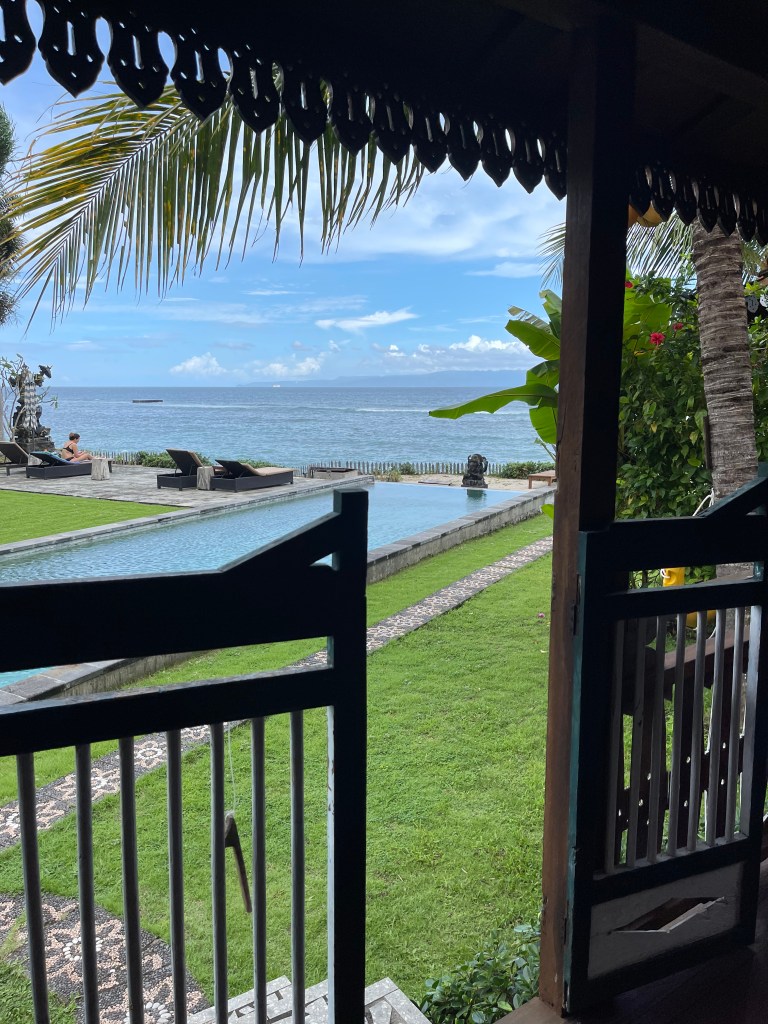 The friendly but barely-speaking-English driver deposited us to what Mike had anticipated a modest hotel on Candidasa Beach, since it was only $80 a night. The Sea Breeze is in a tiny village with a few shops and restaurants, and its little cabins were tucked into a garden almost right on the water, separated only by a short rocky hill. Books in several languages were shared in a beautiful communal veranda, and orchids covered the local trees. It was mesmerizing. By an intimate, rectangular, blue-green infinity pool facing the ocean, about five steps from our private cabana, I watched my ankles diminish and sipped a complimentary welcome cocktail that tasted like someone had just picked the fruit and given it to me as an offering, rather than placing it on an alter to Vishnu as so many Hindus there do every morning.