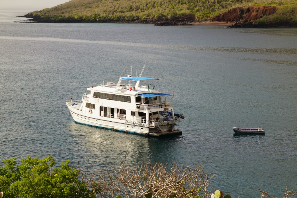 Our visit to the Galapagos Islands had begun immediately upon setting feet on the ground. Aidan hadn’t walked off a plane into hot open air before, that he remembered, at least. His enjoyment of that, and all the creatures seemingly greeting us at the airport and in the town square of Santa Cruz where we spent our first night, made the experience even more indelible. Sea lions and other animals gathered around like old drinking chums; it was practically a scene out of South American Snow White or another Disney movie in which animals interact comfortably with humans. We left Santa Cruz to sojourn on the small cruise boat, as everything online and from conversations with wealthy, Galapagos-savvy friends had suggested it a necessary expense to visit the Islands. The twin beds in my room with Mike were hardly more than cots; I could touch my knees to the door in the head when I sat down. Due to our aft location, everything that went on outside, we were the firsts to know about it. Meanwhile, Aidan had his own room with two twin beds, sunbeams streaming in from quiet midship where there was no walkway.