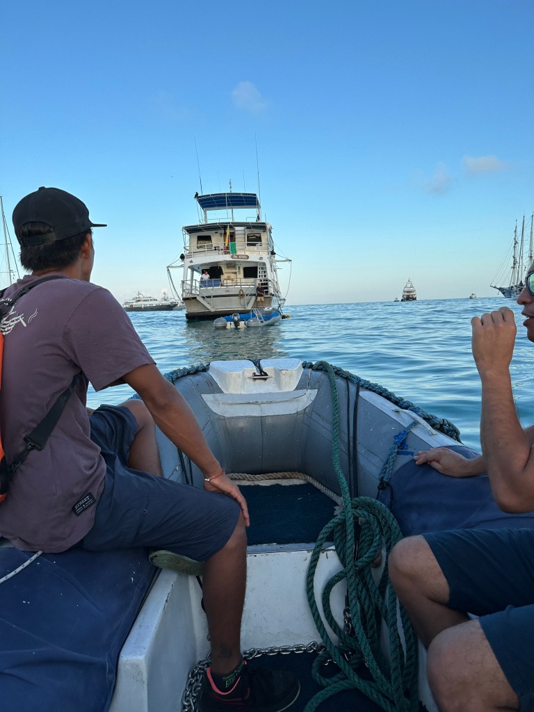 We had stayed for a few nights on his rustic, recognizable boat, the boringly-named Fragata, just a day or two before, rising freakishly early and eating unmemorable food with the crew, helping to tidy, venturing daily to excursions with Jorge, whom I now spied snorkeling with new clients. He barely looked up when I called, but the captain’s love — continuing in the form of his hand-hearts as we drifted far into the distance — overshadowed Jorge’s replacement of us so soon, which otherwise might have seemed a slight. We were no longer the audience for his dad jokes.